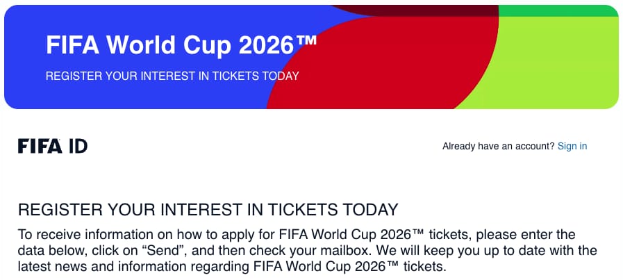 FIFA’s website is conspicuously advertising information on “how to apply” for WC26 tickets